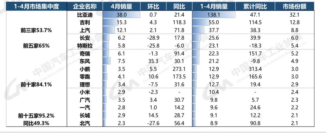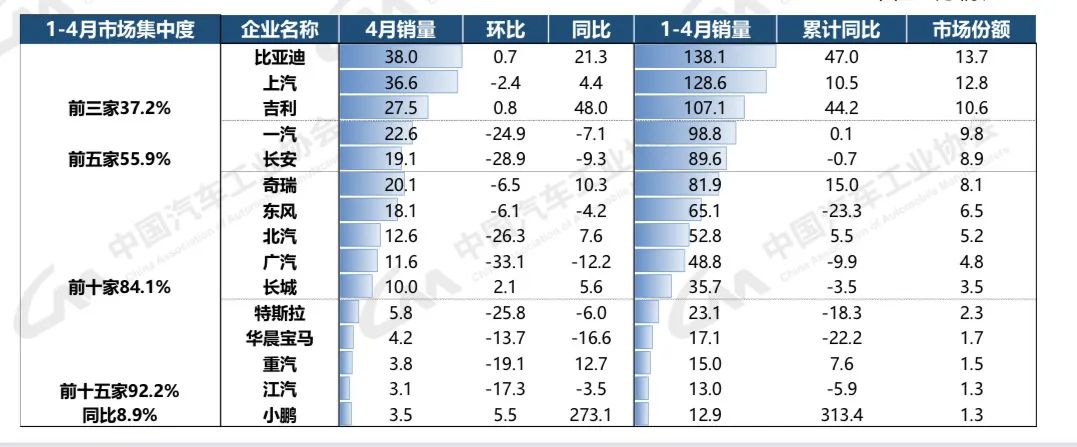 在车企方面,根据中汽协统计,1—4月,汽车销量排名前十位的企业(集团)共销售846.4万辆,占汽车销售总量的84.1%。在汽车销量排名前十位企业中,与上年同期相比,长安汽车、东风公司、广汽集团和长城汽车销量呈不同程度下降,其他企业销量均呈不同程度增长,其中比亚迪和吉利控股增速更为显著。